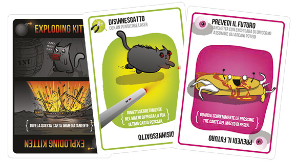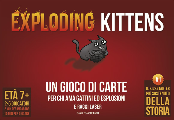 Exploding Kittens è una versione altamente strategica e potentemente felina della roulette russa. I giocatori pescano fino a quando qualcuno non pesca una carta Exploding Kitten: a quel punto quel qualcuno esplode! Dai 7 anni, 2-5 giocatori