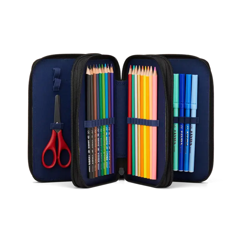 Maxi astuccio Ergobag a tre scomparti, con 40 pezzi, tra cui 18 matite colorate e 18 pennarelli, matite, gomma, temperino, righello, forbici a punta arrotondata, e tasca interna per monete e piccoli oggetti.