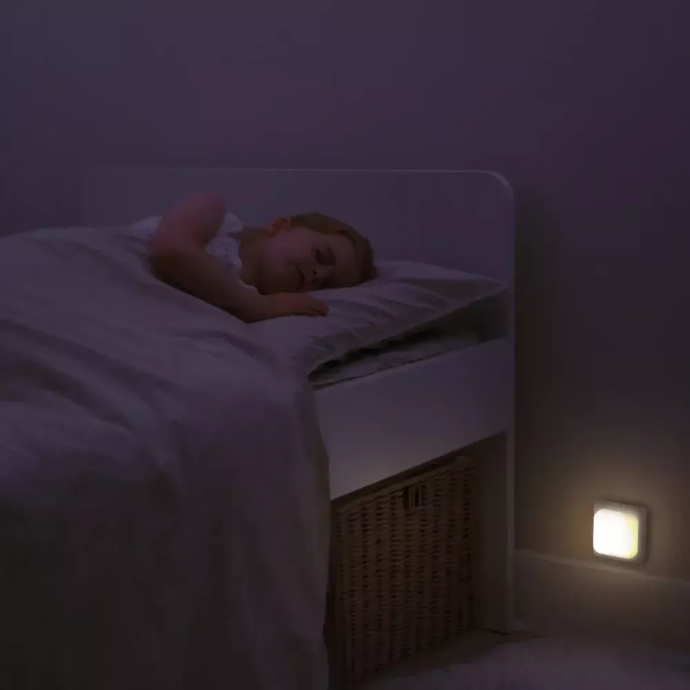 Luce notturna a forma di cubotto, utilizzabile a parete o mobile come torcia. Con tre effetti di luce rilassanti (bianca e rosa), sensore di luce, sensore tattile e timer da 30 minuti.