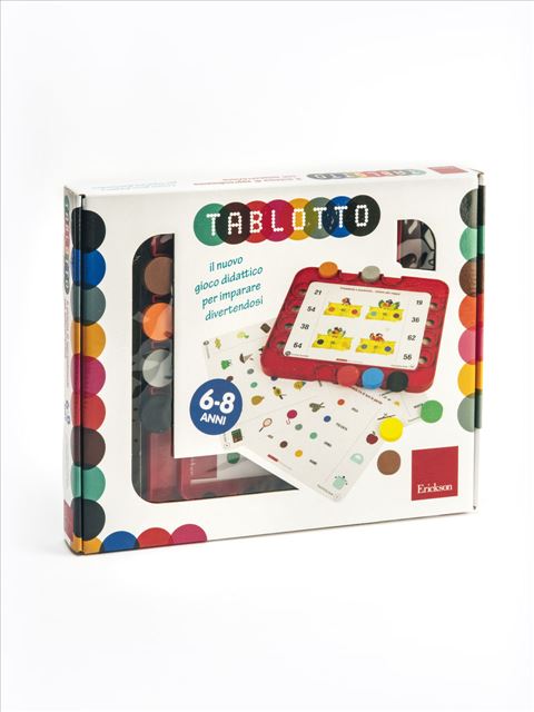 Tablotto è un gioco educativo pensato per bambini dai 6 agli 8 anni ed è studiato per sviluppare, consolidare e facilitare gli apprendimenti di letto-scrittura, cognitivi e logico-matematici. Una cornice rossa con otto pedine si anima grazie a una serie di schede colorate che propongono esercizi divertenti, i bambini indicano le loro risposte, grazie all’intuitivo sistema di pedine colorate e una volta completata la scheda verificano immediatamente la correttezza o meno, semplicemente girando il Tablotto.
