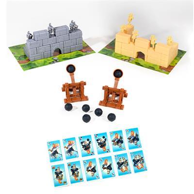 10 miniature, 32 mattoni, 2 archi, 2 plance giocatore, 2 catapulte, 8 massi, 12 carte, regolamento di gioco.