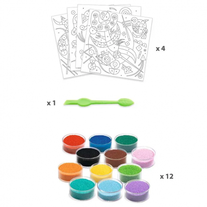 Quattro quadri ispirati ai dipinti di Kandinsky, utilizzando sabbie dai colori vivaci. Guarda attentamente… strane creature sembrano emergere da queste combinazioni astratte! Adatto dai 7 anni