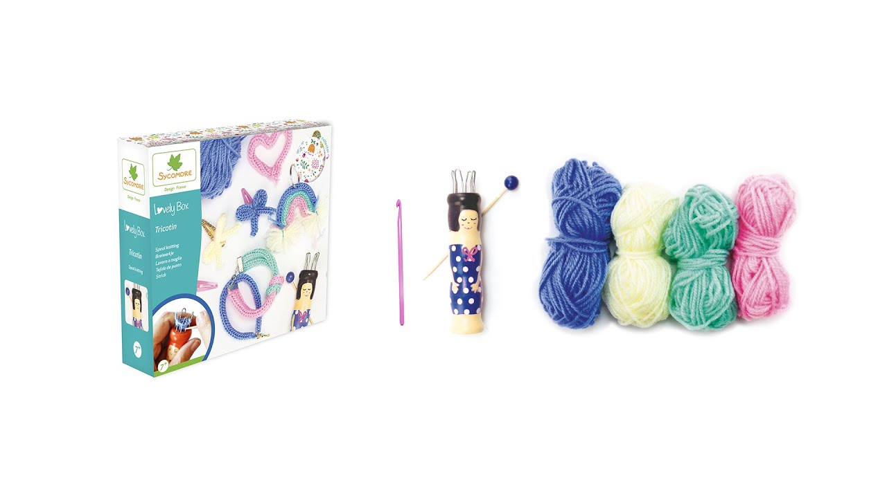 Una deliziosa scatola riutilizzabile con il materiale per lavorare la lana e creare portachiavi, mollette e bracciali.