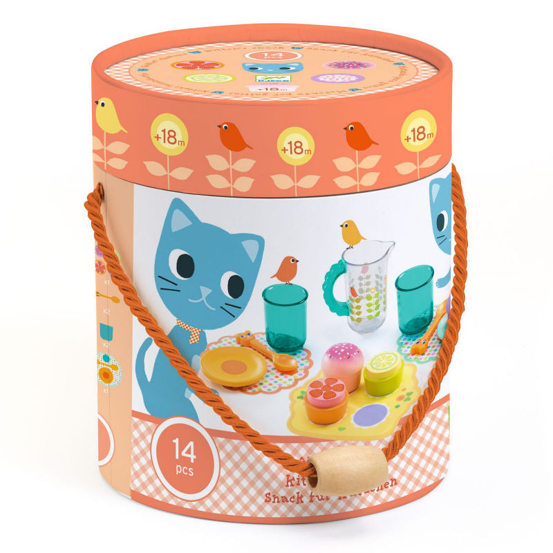 Un kit in legno e plastica, adatto ai più piccoli con comoda confezione a cilindro, con dolcetti, piattini, bicchieri e posate.