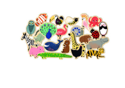 Calamite in legno a forma di animaletto, da comporre e attaccare su una superficie magnetica (non inclusa nella confezione). Dai 2 anni.