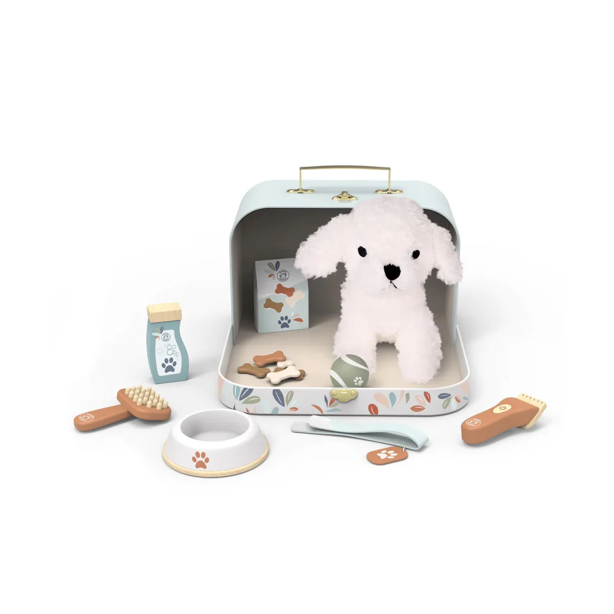 Una valigetta in cartone con peluches a forma di cane e tutto il necessario per prendersene cura, adatto dai 3 anni