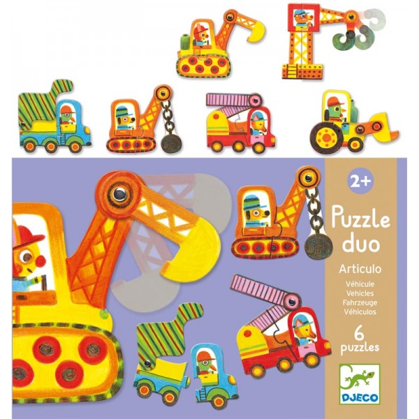 Coloratissimi puzzle a due pezzi, per costruire simpatici mezzi tutti da giocare. Dai 2 anni.