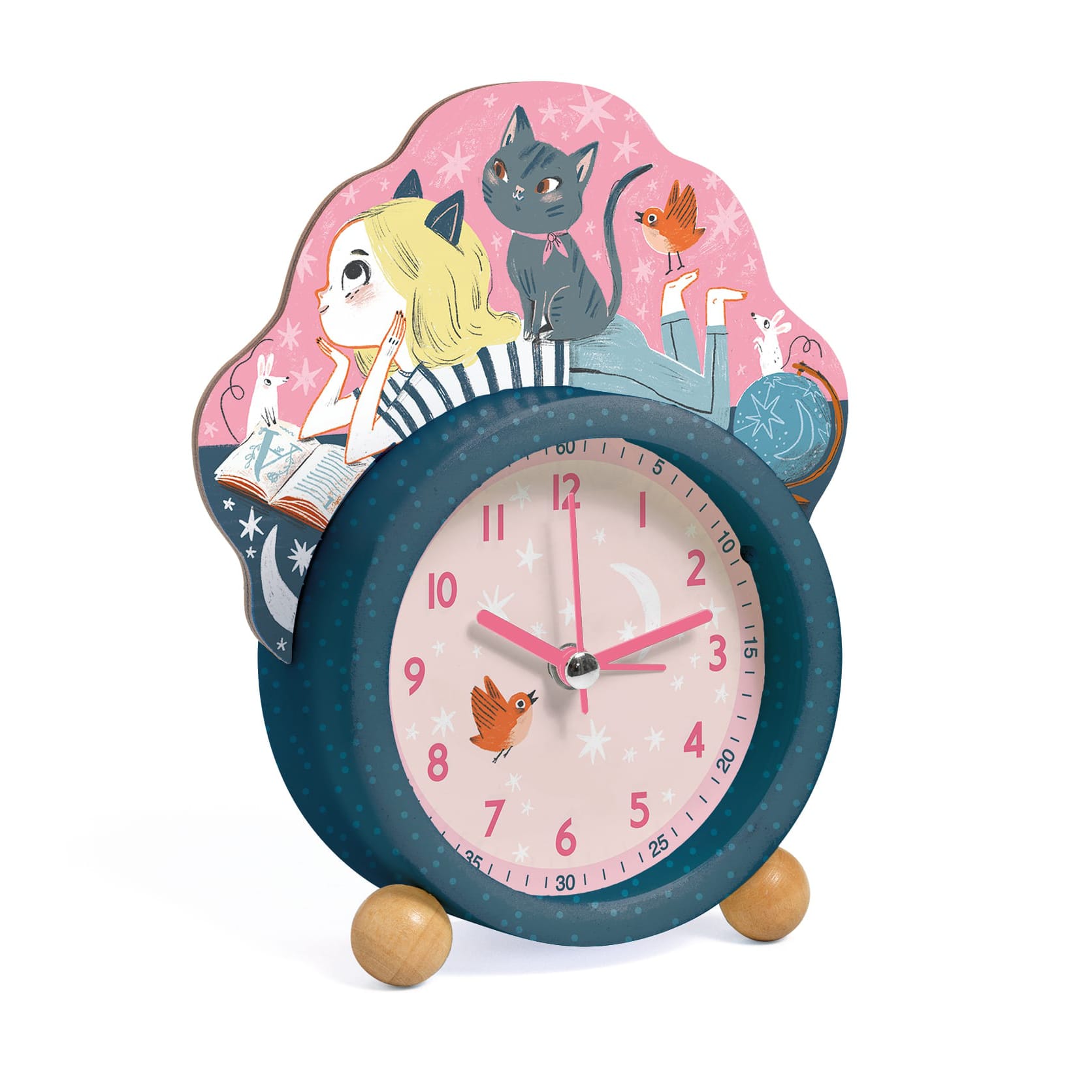 Graziosa sveglia in legno e plastica, con illustrazioni, pulsante luminoso, movimento al quarzo silenzioso e suoneria classica.Funziona con pila LR6 non inclusa.