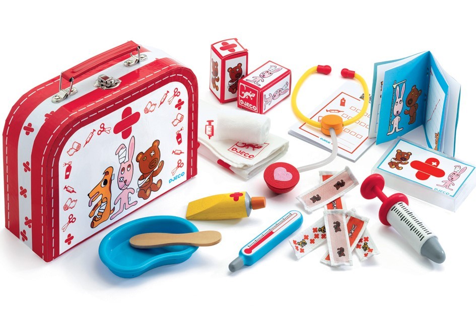 Tanti accessori in legno, vere garzine, cerotti elasticizzati e blocchettino per prescrizioni mediche, il tutto racchiuso in una deliziosa valigetta! Dai 4 anni